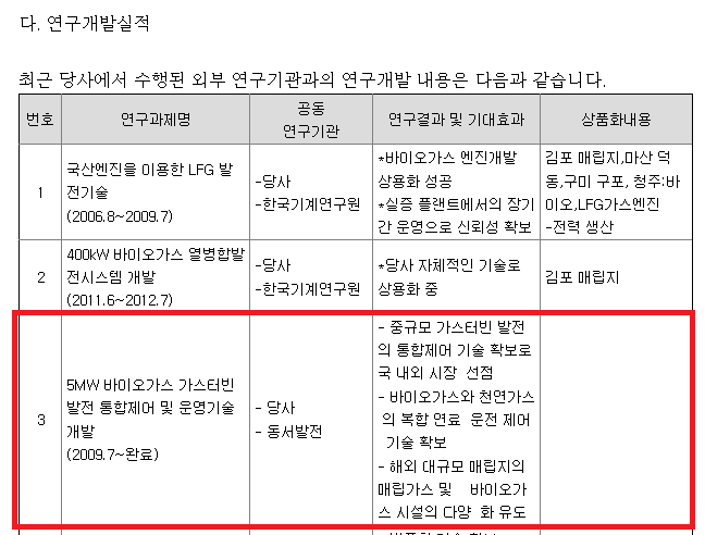 A. 바이오가스 벨라루스쪽에 계속 협상을 진행 중에 있으며, 최근 브라질 발전 설비 시장 진출을 위해서 브라질의 케이에스 인터그룹과 MOU를 체결하였습니다. 뿐만 아니라 2015년 3월에 도미니카 공화국의 열병합 발전 설비 관련 MOU를 현지 푸에르토사와 체결한 바가 있습니다.