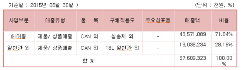 또한 당사의 매출액의 대부분을 차지하는 에어졸의 경우 모기, 해충이 많은 2분기(여름)에 에어졸 관련 상품의 수요가 많다. 평균적으로 2분기 매출액이 다른 분기에 비해 평균적으로 30%이상 높다. (계절의 영향이 크다.)