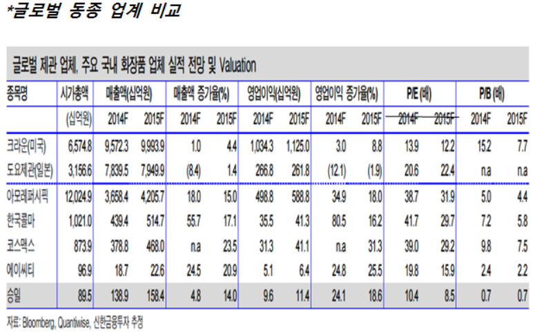 중국인들의 한국화장품 열풍에 따라 급격하게 성장하고 있는 국내 메이저 화장품사(아모레퍼시픽, LG생활건강, 코스맥스)의 에어졸제품에 반독점격(70%)으로 에어졸캔을 납품하고 있다는 점은 분명 매력적인 점이라고 생각한다. 그러나 국내 에어졸 시장의 성장률은 한 자리수(8%)에 불과하며 에어졸 화장품이 중국인들의 한류 화장품 열풍 중심에 있다고 판단하기는 어렵기 때문에 큰 폭으로 당사가 수혜를 받으리라고는 쉽게 생각할 수 없다. 뿐만 아니라 매출액의 30%를 차지하는 일반관 부문의 성장 정체 내지 역성장하는 추세이기 때문에 중국 부탄가스 점유율 50%회사를 인수한 태양이나, ‘안 터지는 부탄가스’ (맥스)제품 개발로 시장 점유율을 늘리고 있는 대륙제관과 비슷한 PER(15)를 받기는 어렵다고 생각한다. 따라서 현재 주가가 매수하기에 매력적이라고 보기는 어렵다고 생각한다. 필자는 내년 초 음성 신공장의 CAPA 증설이 끝난 후 나오는 공장가동률과 생산량을 보고 다시 판단하기를 추천한다.