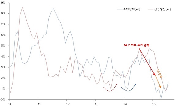 <그림2> 13년 이후 제조업, 14년 소비 회복 기조 vs 유가 급락과 1분기 한파 영향 급락세 중>
