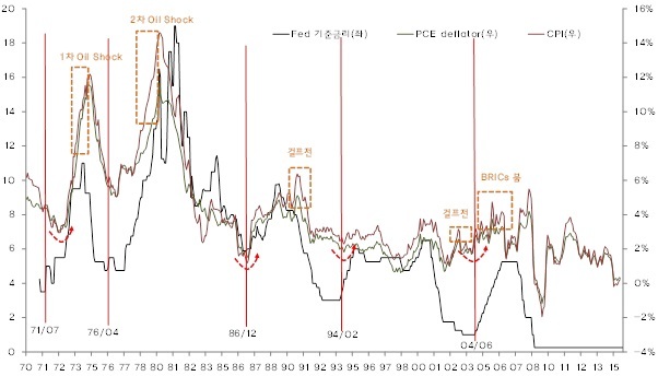 <그림 4> Fed는 항상 물가가 돌아서기 전에 금리 인상을 시작했다>