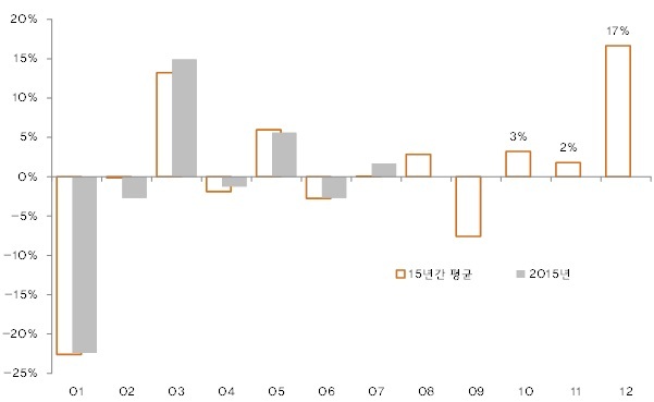 <그림 5> 월별 미국 소매판매 전월비 수치의 15년간 평균과 2015년 수치>
