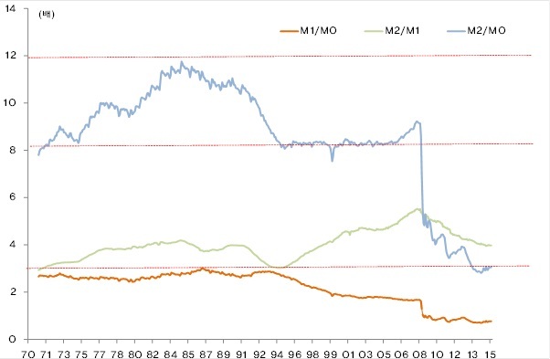 한켠으로 이것은 그간 대규모로 공급된 본원 통화가 시중에 돌지 못하고 은행 안에서만 맴돌고 있어서, 실질적인 유동성인 M1(현금 + 예금)이나 M2가 늘어난 정도는 미미하여 2013년부터는 이미 본원 통화(M0) 규모가 M1를 넘어서는 초유의 사태가 벌어졌다. 우리가 유동성이 많이 풀렸다고는 얘기하지만, 실제로 유동성 효과를 금융 시장 외에서 찾아보기 힘든 것은 이 때문이다.