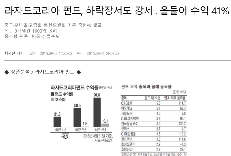 (라자드코리아 펀드가 운용하거나 했던 종목 및 수익률을 보면 하락장에서도 강세를 보이고 올해들어 수익률이 41%에 달합니다. 이러한 TRACK에 따르면 로보스타에 지금 투자한 것은 지금이 적어도 고평가는 아니다 라고 판단하고 있음을 알린다고 볼 수 있습니다.)