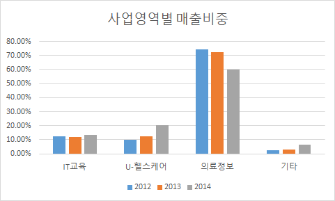 2010년 25억 -> 2012년 33억 -> 2014년 70억으로 2014년에는 전년대비 무려 60%의 매출 신장을 이룩하였다. 이는 2010년부터 유헬스케어 사업부문을 만들어 이에 대한 지속적 투자를 해왔기 때문이라고 볼 수 있다. 위에서 제시한 대로 세계, 국내시장에서의 유헬스케어 시장은 연간 10~20%씩 꾸준한 성장을 하고 있기 때문에 비트컴퓨터 매출 역시 증가하는 추세인 것이다. 현재 유헬스케어 매출은 거의 대부분이 원격진료 시스템 구축에서 발생한다. 이 시장 자체도 현재 전체 시장의 10%도 개화되지 않았다.