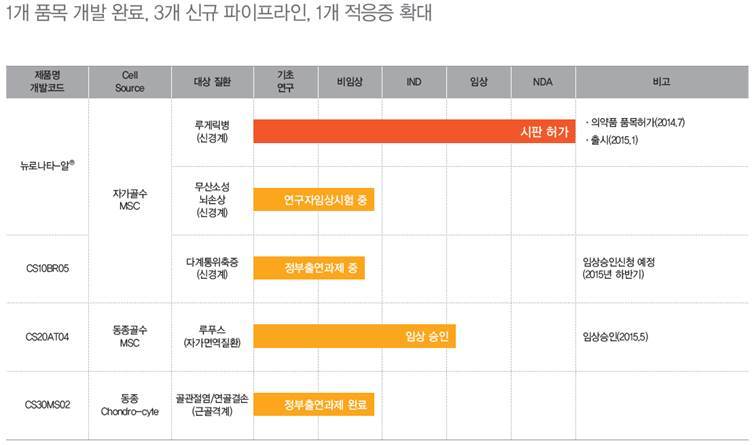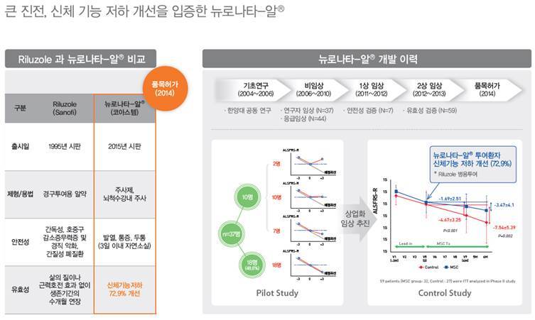 동사는 세계 최초로 루게릭병 줄기세포치료제인 뉴로나타-알을 개발하였습니다. 이 치료제는 전세계 줄기세포치료제에서 5번째이고 국내에서는 4번째이기도 합니다. 기존에 루게릭병 치료제가 품목허가 및 상용화된 것으로는 사노피의 Riluzole이 있는데 이것은 치료제라기 보다는 생존기간을 몇 개월 연장해주는 것에 불과한 효과를 갖고 있습니다.
