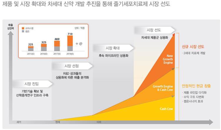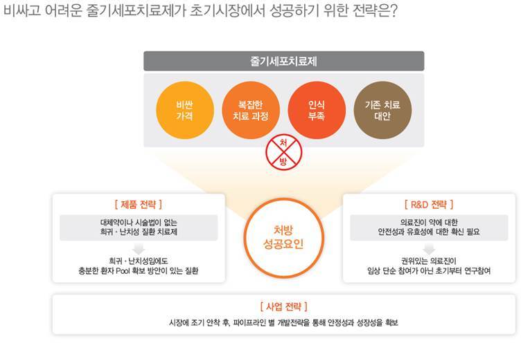 줄기세포치료제는 가격이 비싸고 복잡한 치료 과정이 필요하고 인식이 부족하여 의사의 처방을 받기가 쉽지 않다는 특징이 있습니다. 따라서 이러한 단점을 극복하기 위하여 동사는 다음과 같은 세가지 전략으로 대처해나가고 있습니다.