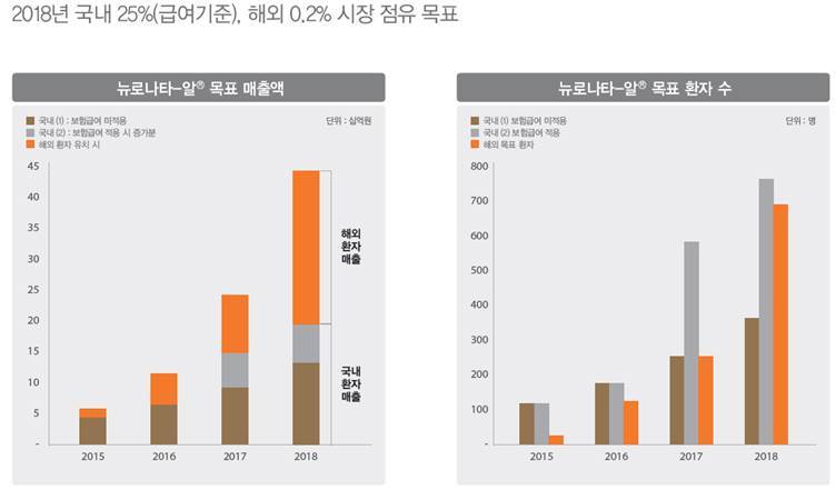국내에서는 올 1월에 비 급여로 시판되었는데 현재 루게릭병 환자가 있는 곳을 대상으로 처방 병원을 확대하고 보험 수가 적용을 위해 협의 중에 있습니다. 보험 수가가 적용되면 환자 부담금은 10%로 줄어들게 되어 국내 수요가 확대될 것으로 보입니다. 전세계 35만명의 루게릭병 환자를 대상으로 수요를 확대하기 위하여 해외 환자를 국내 유치하기 위한 노력과 해외 국가별 현지화 진출을 위한 노력도 함께 진행하고 있습니다.