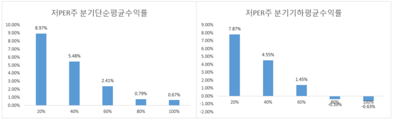 즉, 저PER주에 투자를 하는 것은 미래 실적을 잘 모르더라도 높은 수익을 낼 수 있지만 저PER종목군에 해당하는 종목중에 다음분기 이익증가율이 상위20%, 상위40%그룹의 수익률이 평균이상으로 높기 때문에, 저PER종목임에도 불구하고 실제로 다른사람들의 무관심을 깰만한 다음분기 성장할만한 종목들을 찾아서 투자하는 것이 저PER투자전략에 핵심이라는 것입니다.