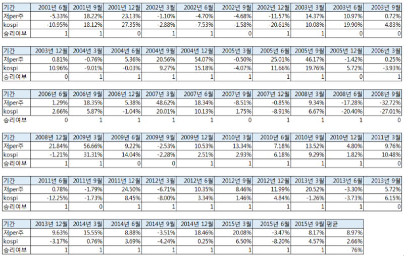 실제로 KOSPI지수대비 승률(KPOSPI지수 수익률보다 높았던 분기의 수 / 전체 분기수)는 2001년부터 75%로 1년 4개분기중에서 3개분기정도는 평균적으로 KOSPI지수를 아웃퍼폼하는 결과를 보였습니다. 즉 단순히 저PER주를 사는 것만으로도 초과수익이 가능하다는 것을 확인한 것입니다.