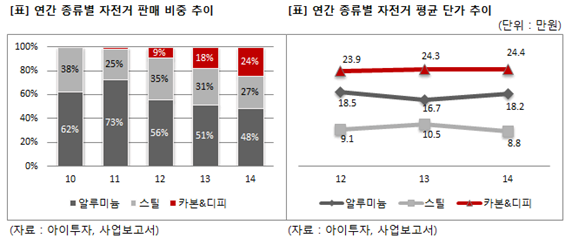 회사의 전기자전거 및 단가 높은 제품 판매를 통한 기업의 성장성은 지금과 비교할 수 없이 크다. 삼성과 협업을 통한 전기자전거가 시장에서 통할 것인가는 미지수이다. 하지만 기술력과 브랜드 파워를 놓고 보았을 때, 시장 진출에 대해 그 가능성을 높게 보아, 본인은 매수 의견을 내놓는다.