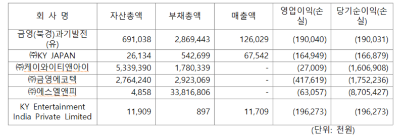 표에서 알 수 있듯이 모회사 금영을 제외한 나머지 모든 종속회사는 크고 작은 영업이익 적자를 기록하고 있다.