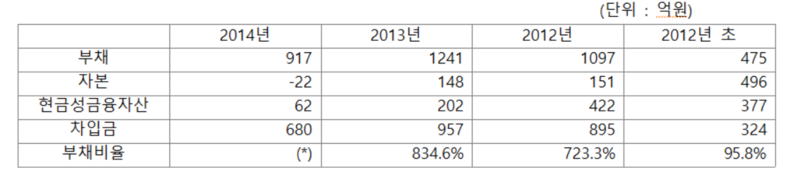 2014년 연결 감사보고서에 따르면 현재 자본 잠식 상태 상황에 이른 것으로 확인되었다.