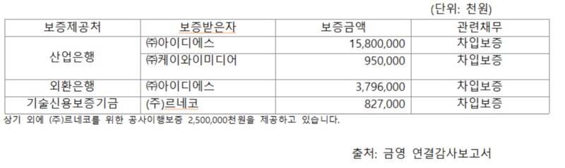 2014년 감사보고서에선 금영이 관계기업 아이디에스와 르네코에 차입보증을 댄 금액만 약 233억원을 넘어선 것으로 보인다.(아이디에스 200억+르네코 33억)
