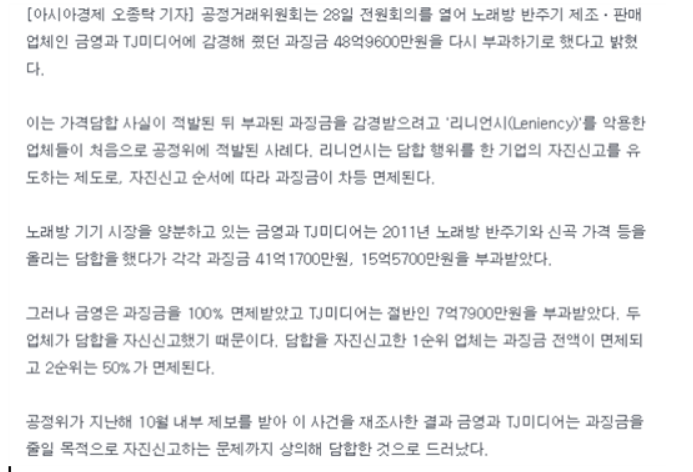2009년 금영과 tj미디어는 노래방 기기 가격 담합으로 인해 과징금을 받게 되었으나 자진신고를 할 일정 금액을 감면해주는 리니언시(Leniency)를 통해 금영은 41억 전액 면제, tj미디어는 15억원 중 절반인 7억원을 추징당하였다.