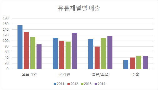 디비케이의 주력 제품인 듀오백 의자 매출을 유통채널별로 살펴보면 왜 디비케이가 적자를 헤매고 있는 지 알 수 있다. 실제 온라인 시장이나 특판/조달 시장에서의 듀오백 의자 매출은 2011~2014년까지 100억 수준에서 유지되고 있다. 그러나 오프라인의 경우 2011년 150억에서 2014년 87억으로 거의 반토막이 날 정도로 매출이 줄고 있다.