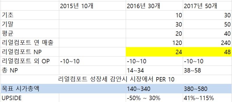 리얼컴포트가 바로 소비 패턴의 변화에 대응하는 방식이다. 월평균 매출이 5천만원이라고 가정한다면 이 중 40%인 2천만원이 의자 매출이고, 매장 1개당 연간 2.4억의 매출이 발생한다. 이러한 가정하 매장 30개가 되면 연간 72억 매출이 발생하여 2011년의 150억 매출 수준이 회복되게 된다. 다만, 리얼컴포트의 경우 리얼컴포트->소비자로 판매가 되는 구조인데 반해, 종합가구점의 경우 디비케이->종합가구점->소비자의 판매가 되는 구조를 지니고 있어 리얼컴포트에서 의자를 판매할 경우가 마진율이 2~3배 정도 더 높게 나타난다. 따라서 2011년의 당기순이익인 20억 수준을 달성하기 위해서는 매장 20개, 매출 120억 수준만 되어도 가능하다.(단, 월평균 매출 5천 + 기존 의자 매출이 80억 수준을 유지한다는 가정하에서).