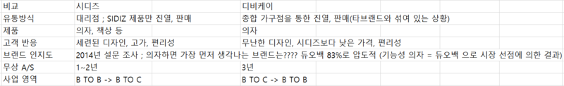 뿐만 아니라 유통 방식에 있어서도 디비케이가 여전히 많은 부분 종합 가구점을 통한 진열, 판매가 이루어지지만 시디즈는 전국 대리점을 구축하여 SIDIZ 제품만은 진열, 판매하는 방식이다. 고객 반응을 살펴보면 시디즈는 고가, 세련된 디자인, 편리성이라는 키워드를, 디비케이는 시디즈보다 낮은 가격, 무난한 디자인, 편리성이라는 키워드를 떠올리고 있어 시디즈가 이미지면에서 디비케이에 비해 우위에 있음을 알 수 있다.