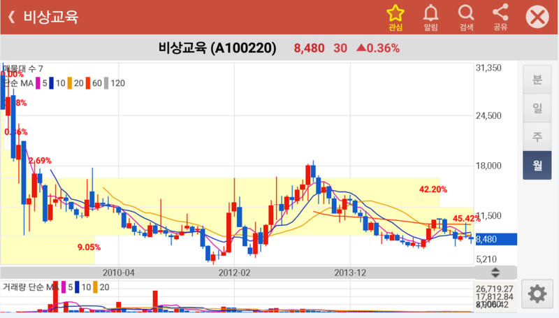 특히 변동성이 심한 장세에서 매년 꾸준히 기본적으로 100억의 당기순이익을 발생시키며 부채비율이 30%대 , 연간 130원의 배당(2015.11.19 기준 - 시가배당률 1.5%)을 하는 비상교육이라는 기업은 안정성을 가지고 있으며 비상을 하기 위해 노력하고 있는 기업일 수 있다....!