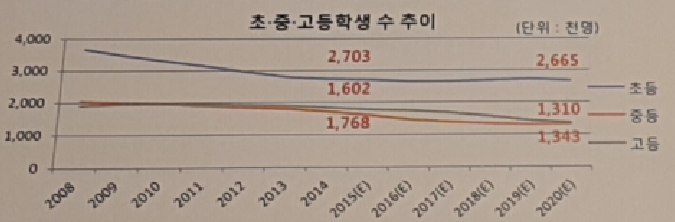 저출산 고령화 기조에 따라 학령인구가 서서히 감소하고 있다. 2020년까지 전체 학령 인구는 지속적으로 감소하는 추세에 있다. 중학생의 경우 연평균 4%, 고등학생의 경우 연평균 5%씩 감소하게 된다.
