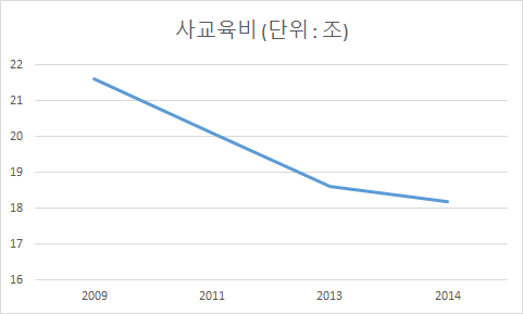 초, 중, 고등학교 감소에 따라서 당연히 사교육비도 급격하게 감소하는 추세이다. 특히 고등학교 교육에 있어서 공교육의 강화 일환으로 수능시험이 EBS와 연계되는 방향으로 전환되면서 고등학교 교육 자체가 EBS에 집중하는 모습으로 바뀌었고 이에 따라 고등학교 사교육비가 급격하게 줄어들면서 2009년 21조 6천억이었던 사교육비가 2014년 18조 2천억으로 불과 5년만에 16% 이상 감소하였다.