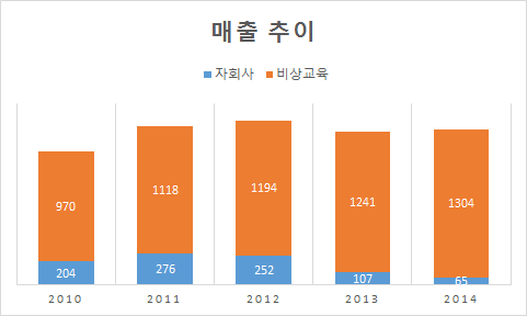 (비상교육의 출판사업, 오프라인 학원사업 등 전 사업부문이 교육 대상자인 학생의 수와 밀접하게 연관이 있다는 점을 고려시 서서히 매출액이 감소할 것이라는 것을 예상할 수 있다. 실제로 2012년 매출 1446억 -> 2014년 1369억으로 매출액이 소폭 줄어들고 있다.)