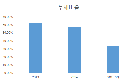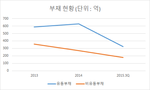 부채 비율 역시 2013년 62.5% -> 2014년 57.7% -> 2015.3Q 33.4%로 재무적으로 완전히 안정적이라고 볼 수 있다. 이러한 부채 상환은 결국 기업의 이자비용을 감소시킬 것이다. 특히 2014년 말과 비교해서 유동부채가 300억 가량 줄었고 이자율 3%기준으로 보더라도 이자비용이 연간 9~10억 가량 감소하는 효과를 가지고 온다.
