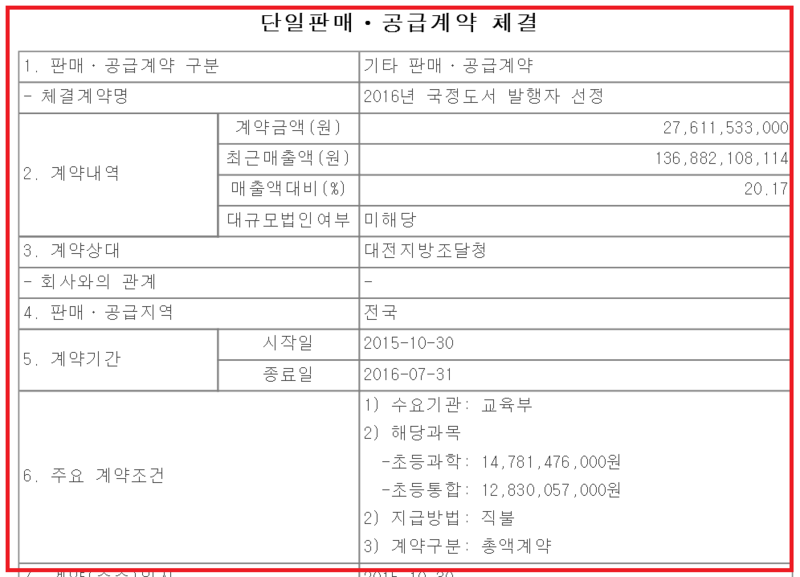 2015.11.02일 비상교육의 공시내용이다. 2016년 국정도서 발행자로 선정되었고 초등과학 및 초등 통합에서 276억원을 계약했다는 것이다. 중,고등학교 교과서 시장의 강자인 비상교육이 초등학교 교과서 라는 새로운 시장을 개척했다. 2015년 10월 30일 ~ 2016년 7월 31일 까지 1년까지 계약으로 2016년도 1학기, 2학기 교과서용 도서를 인쇄 발행하는 것을 그 내용으로 한다.
