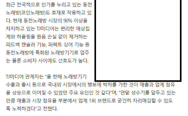 (그동안 여러 노래방에 관한 기사나 금영 홈페이지에서도 국내 점유율 1위 노래방 기기는 10여년이 넘도록 금영인것으로 확인 되었다. 점유율은 금영이 60~65%를 차지하고 있는 것으로 추정되나 최근 기사에서는 동전 노래방 대부분의 기기가 TJ 제품을 사용하면서 점유율을 따라 잡고 있다.)