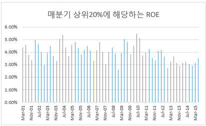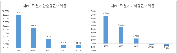 그런데 여기서 재미있는 사실은 단순 저PER주를 투자하는 전략의 경우 지난글을 통하여 분기평균 9% 기하평균 8%로 더 높은 수익을 보인다는 것을 보인 적이 있습니다. 즉 저PER전략이 고ROE를 사는 전략보다 같은 기간동안 분기 2~3%정도 우위가 있는 것으로 나타났습니다. 필자의 생각으로는 ROE는 부채가 많은 경우 그 수치가 높을 수 있으며, 일회성요인으로 인한 순이익 증가로 한 분기만 ROE가 월등히 높은 경우 위의 전략으로 걸러낼 수 없기 때문이라고 판단하였습니다.