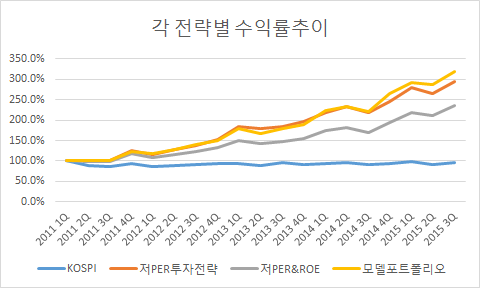 결과를 해석하면 저PER투자전략이 ROE 10%이상인 주식을 사는 것보다 단일전략으로는 더 높은 수익을 거두었으며, 두가지 투자전략을 섞는것 보다도 좋은 수익률을 보였습니다. 하지만 여기서 추가적인 오류가능성을 제외(부채비율)한 모델포트폴리오의 경우 저PER투자전략과는 거의 비슷한 수준의 수익률을 거두었다는 것입니다. 2011 1Q에 10%이상 ROE가 되는 기업이 매우 적었다는 점을 감안하여 2011년 2Q부터 본다면 더 적은 종목으로 표준편차도 적으며 평균수익률도 높은 결과를 보였습니다.