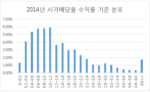 2014년 기준으로 배당수익률에 따른 분포를 보면 우리나라 상장기업들 중의 절반 정도(46.03%)는 배당을 전혀 하고 있지 않았습니다. 이를 제외하고 분포를 보면 1%미만의 배당수익률을 보이는 기업이 22.41%가 존재하였고, 이를 제외하면 30%조금 넘는 기업만이 배당수익률이 1%.이상이었습니다. 그리고 배당수익률이 4%이상 되는 기업들도 2%내외를 보였습니다.