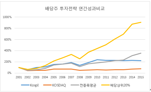 2001년부터 누적으로 수익률을 비교한 결과 배당주 상위 20%에만 투자하더라도 2001년부터 2015년까지 무려 9배에 해당하는 수익률을 거둘 수 있었습니다. 이는 연 복리수준 17%로 배당수익금까지 더한다면 연 18%정도의 복리수익이 발생한 것입니다. 놀랍지 않습니까? 그레이엄과 도드가 말한 것은 바로 이러한 사실이었던 것입니다.