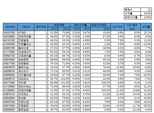필자는 위의 검증 결과를 바탕으로 배당주 모델포트폴리오를 다음과 같이 제시해드립니다. 저번 글에서와 마찬가지로 모델포트폴리오는 특정종목에 대한 분석이 아니기 때문에, 특정개별종목으로 투자대상을 국한 시키신다면 직접 추가적인 정성분석을 할 것을 권해드리며, 금리수준이상을 원하는 투자자라면 모델포트폴리오에 착안하여 투자아이디어를 얻으시는 것도 괜찮을 것으로 판단하고 추천해드립니다.