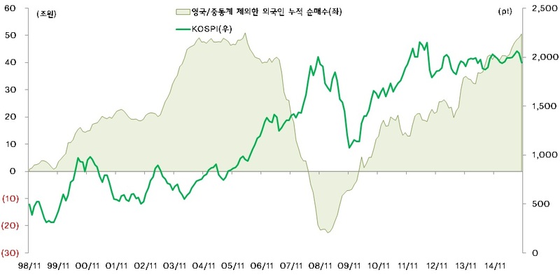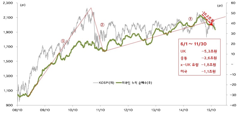 금융감독원의 국내 주식 시장에서의 외국인의 국별 순매매 통계를 살펴보면, 6월부터 11월 사이 외국인은 총 10.5조원을 순매도 했고, 이중 5조원이 영국계, 3.3조원이 중동계의 순매도다. 이 기간 중 중국의 위안화 절하로 KOSPI가 1,800pt까지 갔던 구간이 있기 때문에 , 전통적인 한국 시장의 외국인 매매의 주도 세력인 미국계나 영국을 제외한 유럽계(x-UK 유럽)의 매도도 일부 있었지만, 대부분 영국계와 중동계 자금의 매도가 이 기간의 외국인 순매도의 대부분을 설명한다. (10.5조 중 8.6조)