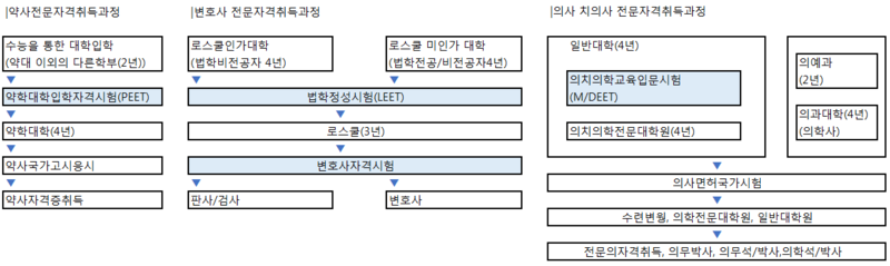 현재 약사, 의사,치과의사, 변호사가 되는 방법은 다음 그림과 같습니다.
