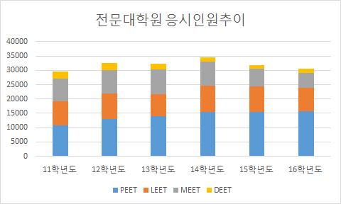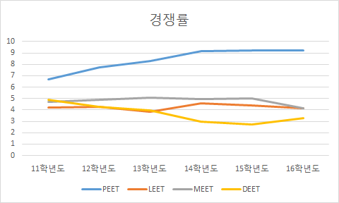 메가엠디는 현재 약학대학입학자격시험과 법학적성시험, 의치의학교육입문시험 관련 시장에 진출하였습니다. 뿐만 아니라 2015년 7월부터는 로스쿨 졸업 후 변호사 자격여부를 판단하는 변호사자격시험에도 진출하였습니다. 각각의 경쟁률은 다음과 같습니다.