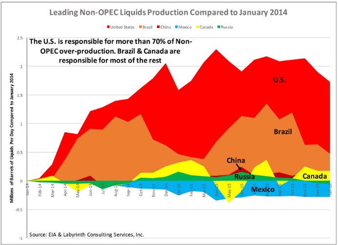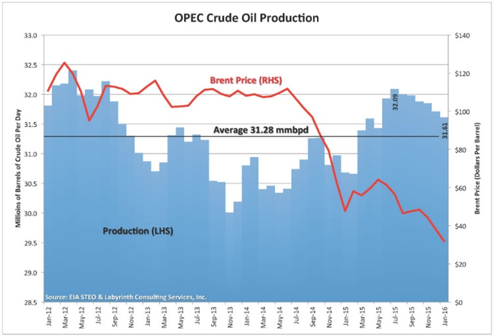 2014년부터 시작된 공급과잉의 원인이 OPEC에 있다고 보기 힘들다. OPEC의 원유 생산량이 2014년 1월부터 조금씩 증가한 것이 사실이다. 그러나 2015년 하반기부터 2016년 1월까지의 생산량은 OPEC의 최근 4년 평균을 조금 넘는 수준밖에 되지 않는다. (OPEC의 최근 4년 평균 생산량은 1일당 31.28백만배럴이다.)
