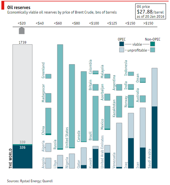 또한 OPEC의 현재 상황은 생각보다 나쁘지 않다. 사우디아라비아와 그 인접국들은, 지질학적 이점 덕분에, 유가가 브렌트유 기준 20불일 때에도 석유 생산에서 경제성을 가진다.