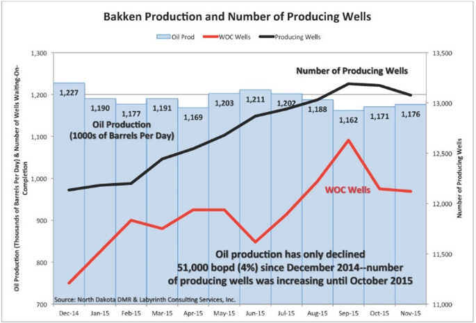 미국의 원유 생산량은 2015년 4월(9.69백만배럴/일)에 정점을 찍고, 이후 2016년 1월(9.13백만배럴/일)까지 감소하는 추세를 보여줬다. 그러나 셰일가스 산업에 투입된 외부 자본은 2015년 말에야 줄어들기 시작했다고 볼 수 있다. 이유는 바켄의 유정 수가 2015년 9월에서야 감소하기 시작했기 시작했기 때문이다. (셰일가스 산업에 투입된 자본이 줄어든다면 유정 수도 감소할 것이라고 추측할 수 있다.)