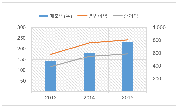 최근 유통채널이 불황이라고 하지만, 모다에겐 다른 나라 얘기입니다. 매출액은 2013년 482억원 → 2014년 604억원 → 2015년 778억원으로 성장했으며, 같은 기간 영업이익은 174억원에서 241억원으로 늘었습니다. 매출액은 연평균 27%, 영업이익은 18% 증가했습니다.