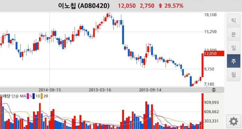 지난해 스마트폰 업황이 부진하면서 이노칩의 실적도 꺾였고, 이에 따라 한때 1만8000원에 달했던 주가가 반토막 나기도 했습니다. 최대주주 대명화학의 입장에선 이노칩의 최근 약세가 모다와 합병 이벤트를 통해 이노칩 지분을 늘리는 데 절호의 찬스였던 셈입니다.