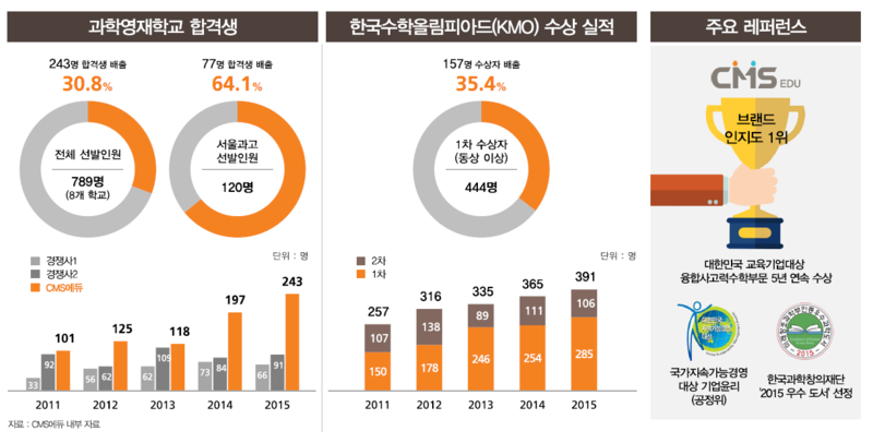 전국 780명 뽑는 영재고등학교 모집 정원이 있는데 그중 230명을 씨엠에스에서 보내고 있습니다. 그리고 가장 우수한 영재학교 중 하나인 서울과학영재학교는 120명 전원중 77명이 동사의 원생이며 수석, 차석을 모두 차지하고 있습니다. 이런 말을 듣고 부모들이 씨엠에스에듀로 몰려오고 있다고 합니다.
