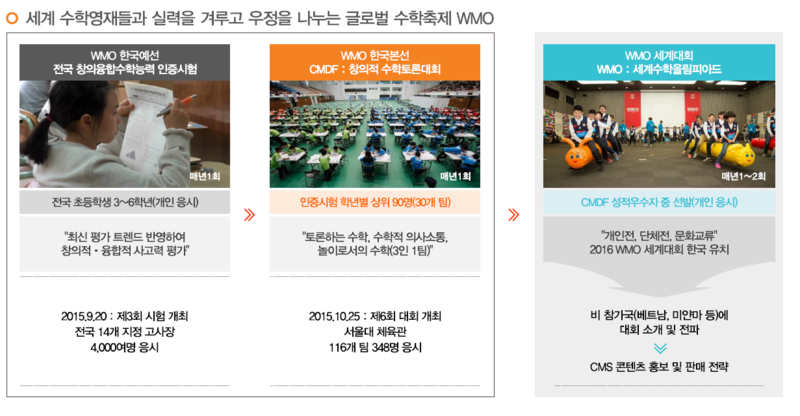 그리고 CEO가 WMO라는 세계 수학 올림피아드 기관의 부위원장입니다. 여기서 세계수학경시대회를 개최하는데 중국에서 뽑으면 10명 뽑는데 200만명 참여하는 등 전세계적으로 정부에서 아이들 뽑아서 데리고 옵니다. 그런데 이런 국제대회에서 씨엠에스 원생들이 한번도 우승을 놓친적이 없다고 합니다. 당연히 이들이 왜 이렇게 잘하는지 관심사가 될 수 밖에 없고 정부에서 공부하는 것을 알고 싶어하고 사람들이 관심을 가지고 자연스럽게 씨엠에스 컨텐츠가 홍보되는 역할을 하게 됩니다.