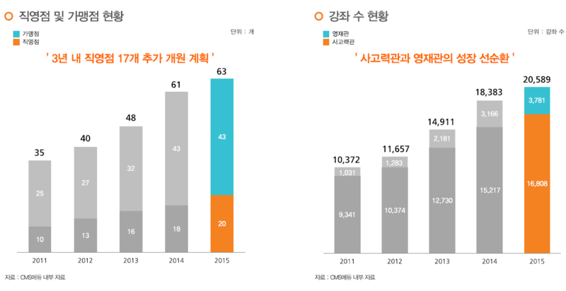 씨엠에스에듀는 표면적으로는 수학 전문학원입니다. 하지만 경영진은 회사의 정체성을 다르게 정의하고 있습니다. 수학을 도구로 활용(수학이 명쾌하게 답이 나오기 때문)한 사고력 증진 학원이라고 말이죠.