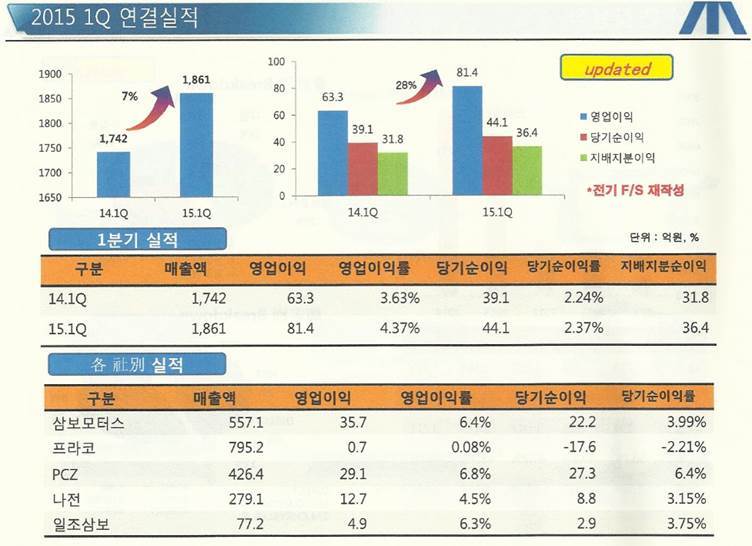 15년 2분기는 영업이익 120억을 전망하고 있습니다. 프라코의 영업이익이 정상화 되고 있어서 1분기 대비 이익이 증가할 전망입니다.(프라코는 프라코 체코와 거래하기 때문에 국내 원화를 유로화로 환전하여 납품하는데 유로화가 떨어지면서 원가가 개선되고 있고, 프라코 국내법인은 조금 더 판가를 올려서 판매하고 있다고 합니다.) 또한 삼보모터스 국내법인도 이익이 증가할 것으로 보고 있습니다.