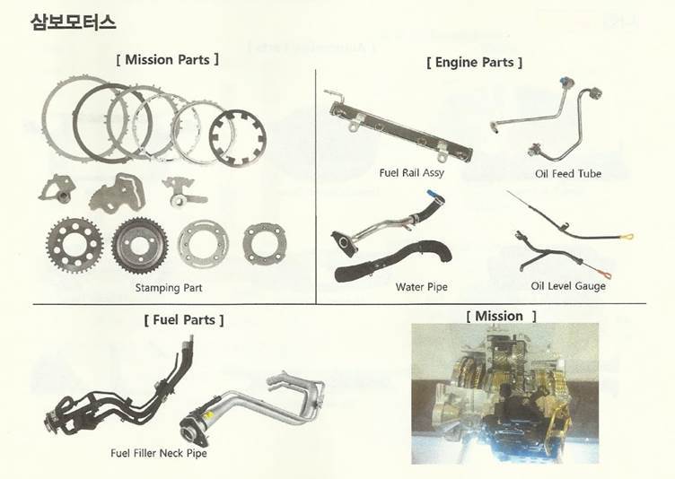 삼보모터스는 자동차용 자동변속기 Plate와 자동차 내부의 각종 파이프류 등의 부품을 스틸을 이용하여 생산하고 있습니다. 자동변속기 부품은 올 뉴 투산의 7단 DCT, 현대차 독자개발 DCT 등이 확대됨에 따라 납품물량이 줄어들 가능성 있는 반면 각종 파이프 부품쪽은 경쟁력이 있어 지속 성장할 전망입니다. 특히 GM이나 컨티넨탈쪽으로 수주가 지속적으로 늘어나고 있기 때문에 미주 및 중국 지역의 영업을 적극적으로 진행하고 있으며, 전체 매출의 20%를 차지하는 일본은 지속적인 엔저로 수익성이 줄어들고 있지만 신규 고객사 발굴에 대한 영업을 지속적으로 추진 중에 있습니다.