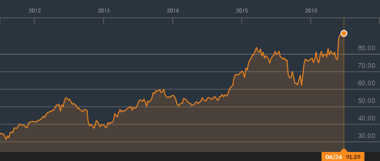 최근 미국 주식시장에서는 저가전문유통기업이 가성비시대의 최고의 비즈니스 모델로 부각 받고 있습니다. 글로벌 경제가 저금리, 저성장 기조가 장기화 됨에 따라 저가전문유통기업들은 불황이 아니라 오히려 호황을 보여주며 급성장하는 모습을 보여주고 있습니다. 시장에서의 많은 관심들로 인하여 최근 브렉시트로 인한 글로벌 증시가 큰 조정을 보여주었음에도 불구하고, Dollar tree는 오히려 지속적으로 사상 최고가를 경신하는 모습을 보여주고 있습니다.