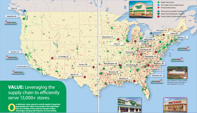 Dollar Tree는 2015년 2분기 경쟁업체인 Family dollar를 최종인수(인수금액 10조 3000억원)를 통해 현재 미국 내 달러샵 매장 수 기준 1위 업체가 되었습니다. 현재 Dollar Tree는 미국 전역에 13,997곳의 매장을 운영 중에 있습니다.(최근 분기 기준)