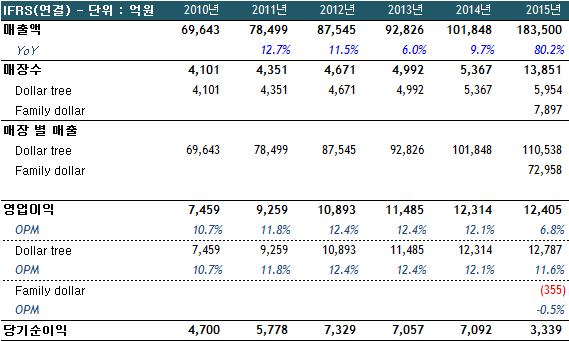 또한 매 분기 매장 수가 꾸준히 증가하고 있어 앞으로의 성장이 더욱 기대되고 있습니다. (현제 1Q16 기준 매장 수 13,997곳= Dollar tree(6,049) + Family dollar(7,948))